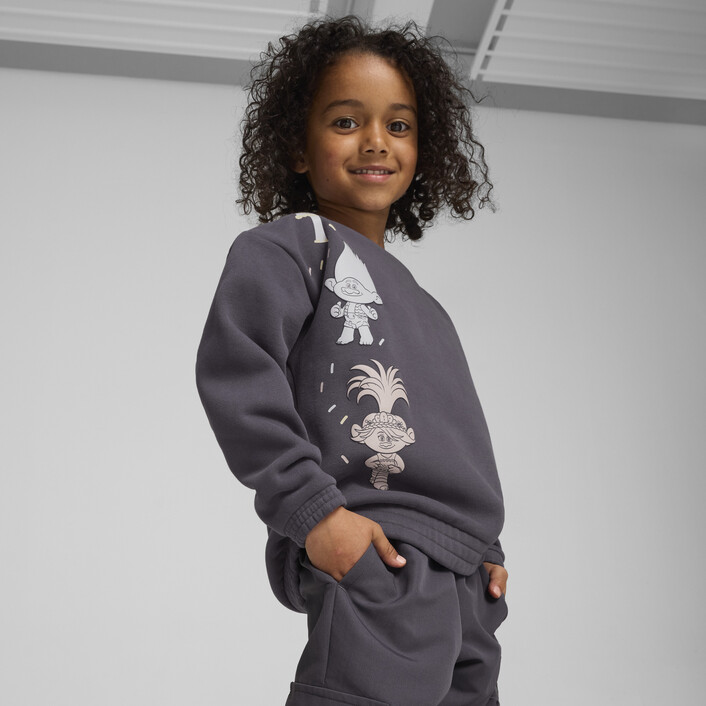 Step into the sweet universe of PUMthtA x TROLLS. The newest collection is inspired by the beloved characters, vibrant colours, and positive vibes. Featuring candy-coloured graphics, Trolls-tastic details and comfy fits, these styles are here to stay. This graphic crew features TROLLS graphics on the front and back.